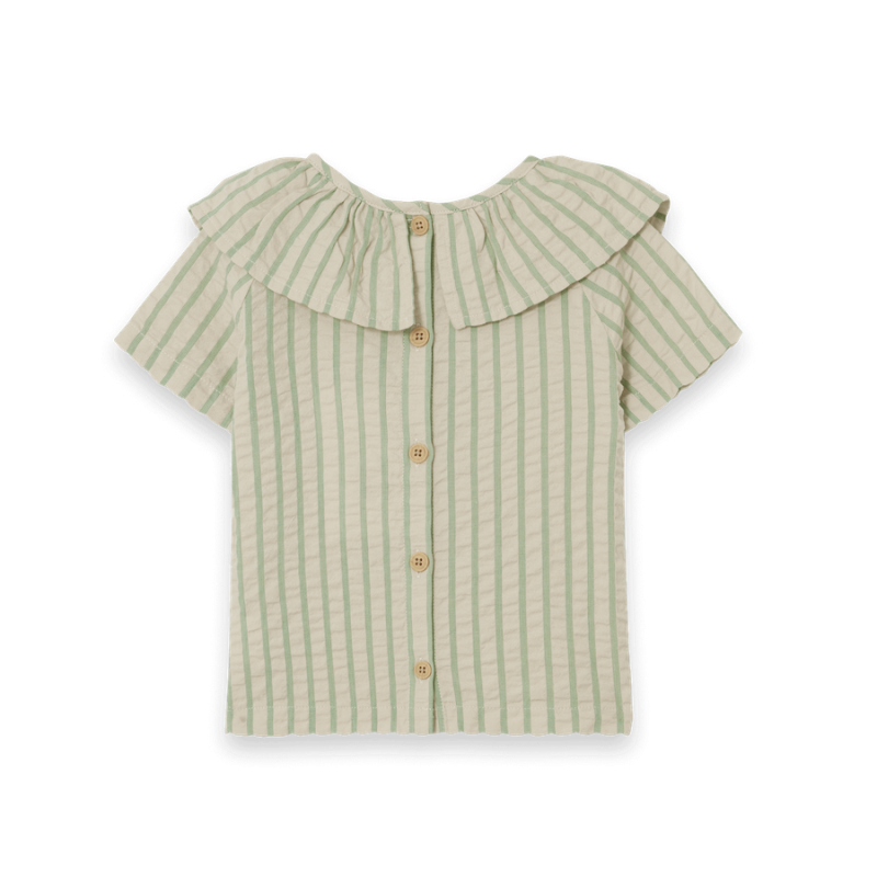 Blūze ar īsām piedurknēm vieglas kokvilnas seersucker kvalitātē. Blūzei ir liela volānu apkakle un aizmugurē skaistas (koka imitācijas) pogas, lai to būtu viegli uzģērbt.