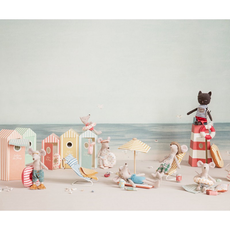 Atvaļinājuma laiks! Mazais pūslis, kas izgatavots no pārklāta auduma autentiskam izskatam. Tas nav ūdensizturīgs, tāpēc rotaļājieties ar to tikai uz sausas zemes. Tikai tavā iztēlē tas peld pa ūdeni. Šis komplekts ir piemērots mazuļa izmēra pelēm un mazajai māsai un mazajam brālim.