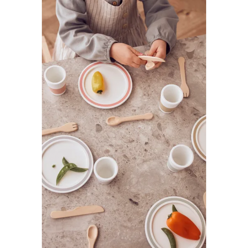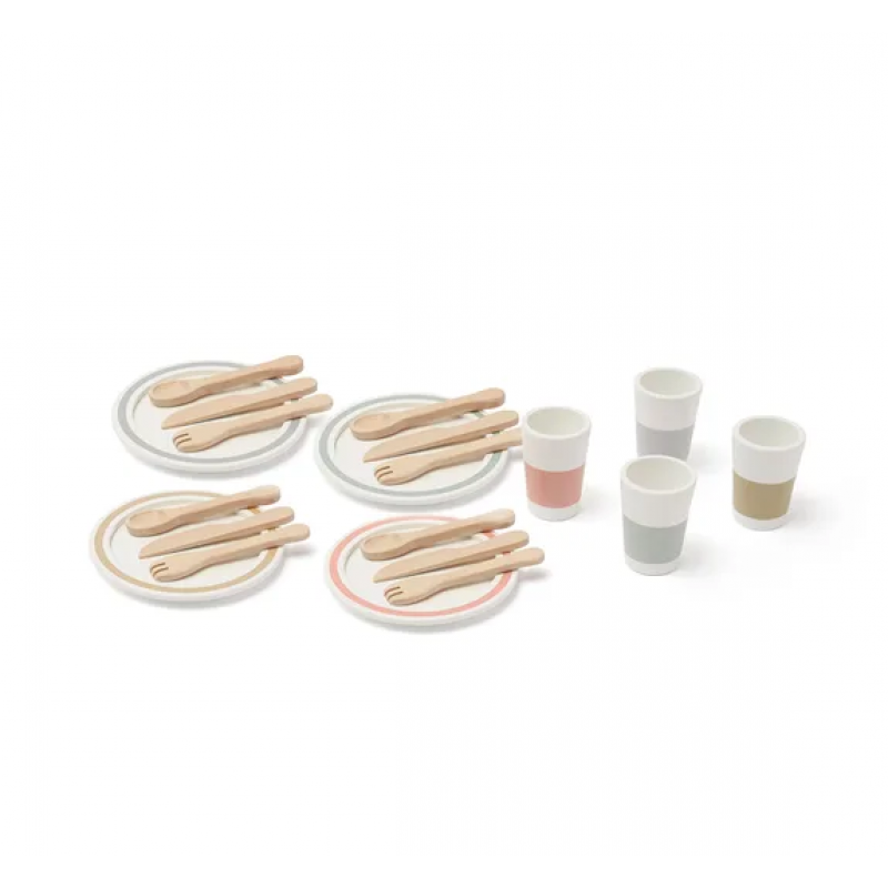 Komplektā ietilpst 4 koka šķīvji, 4 krūzes, 4 naži, dakšiņas un karotes, padarot to par lielisku papildinājumu jebkurai koka rotaļu virtuvei. Izklaidējošs rotaļu laiks un bezgalīgas rotaļu iespējas. Koka trauku komplekts ir lielisks veids, kā rosināt izdomas bagātas un radošas lomu spēles.