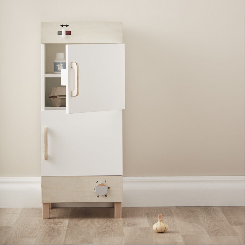 Bērniem būs jautri nolikt pārtikas preces ledusskapī ar visiem nodalījumiem, gluži kā īstajā ledusskapī jūsu mājās. 2 iekšdurvju plaukti, no kuriem vienā ir 2 olu turētāji un papildu atvilktne apakšā dārzeņiem un augļiem. Bīdāms slēdzis ledusskapja temperatūras regulēšanai Ieslēgšanas/izslēgšanas poga ar klikšķa skaņu. Rotaļlieta tiek piegādāta izjauktā veidā, pieaugušajam būs nepieciešams to samontēt.