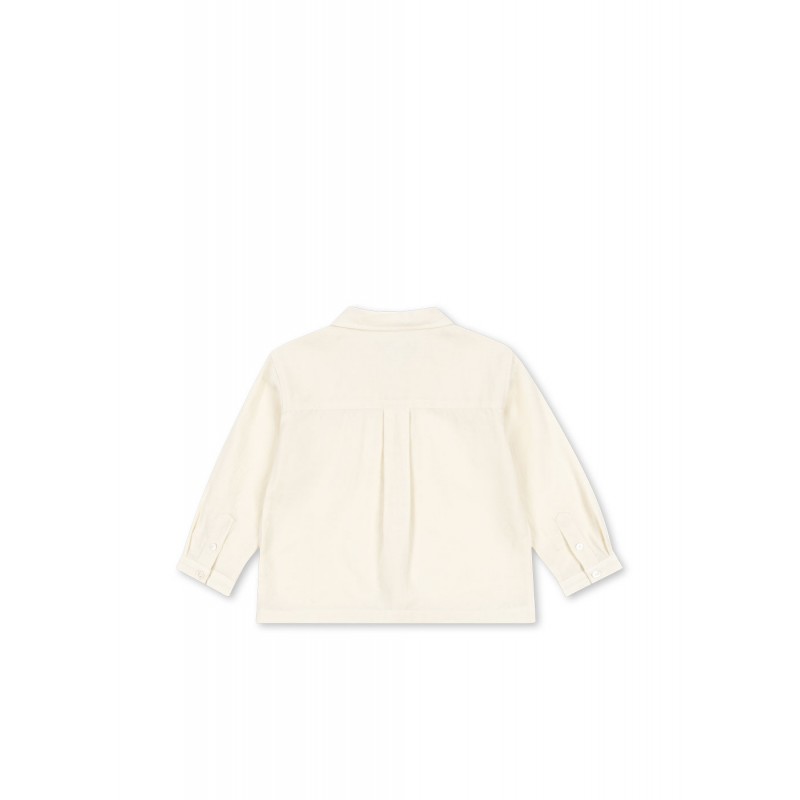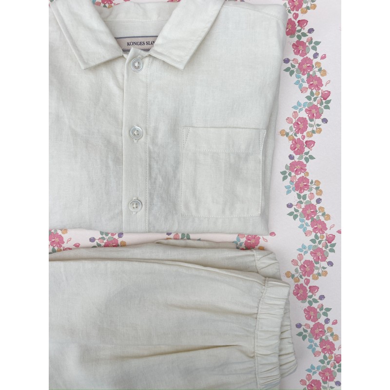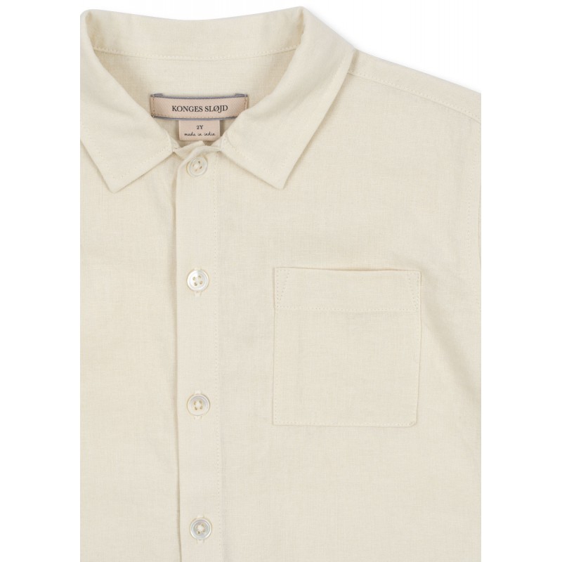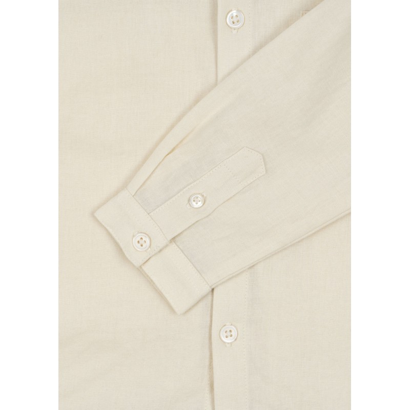 Izgatavots no elpojoša lina maisījuma ar parastu apkakli un pogas atvērumu priekšpusē.
