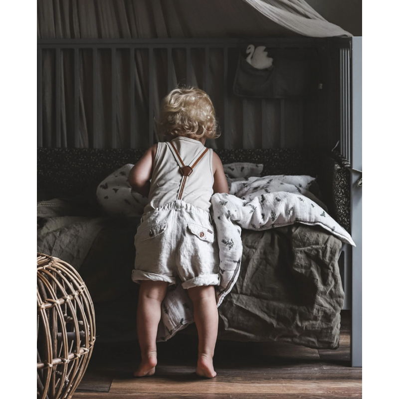 Šī gultiņas apmalīte ir ideāls bērnu gultiņas aksesuārs, kas pasargā jūsu bērnu no plaukstu un pēdu iestrēgšanas starp gultiņas redelēm. Apmalīte ir izgatavota no 200 tc kokvilnas Perkāles auduma, piepildīts ar izturīgām netoksiskām poliestera putām. 360 cm garā apmale ir piemērota lielākajai daļai gultiņu ar redelītēm un tiek piestiprināts ar dekoratīvām skujiņu lentēm.