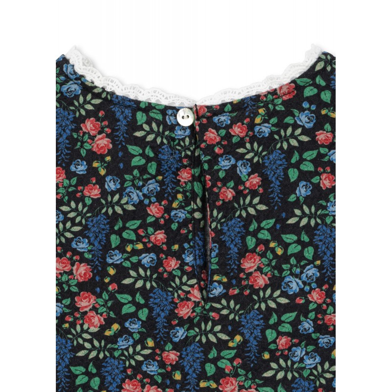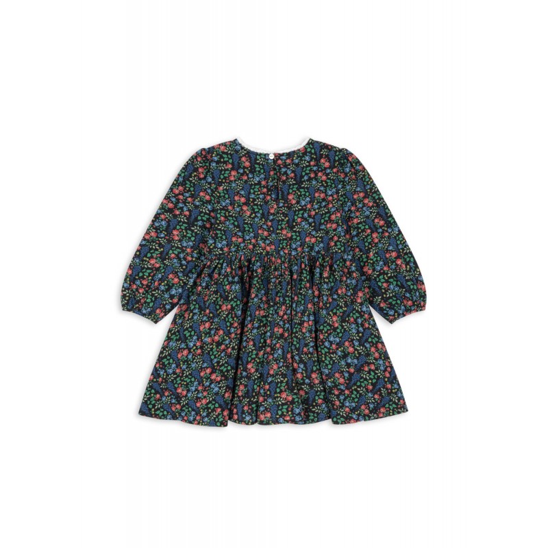 Mīksta organiskās kokvilnas kleita ar uzpūstām piedurknēm. Dizainēta ar izliektu svārku daļu, mežģīņu apkaklīti, izteiktu jostasvietu un dekoratīvām ielocēm.