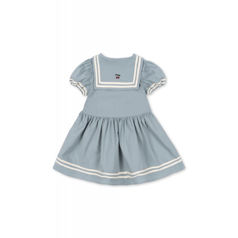 Jūrnieku iedvesmota kleita ar maigu siluetu, lielizmēra jūras krāsas apkakli un pufīgām piedurknēm. Savilkts jostasvietā glaimojošam siluetam.